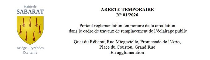 01/2025 - Du 19/01/26 au 23/01/26 : Permission de voirie portant temporaire de la circulation dans le cadre de travaux de remplacement de l’éclairage public - En agglomération - Quai du Rébarat, Rue Miegevielle, Promenade de l’Ario, Place du Coustou, Grand Rue.