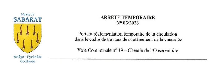 03/2025 - Du 23/03/26 au 10/04/26 : Permission de voirie portant réglementation temporaire de la circulation dans le cadre de travaux de soutènement de la chaussée - Voie Communale n° 19 : Chemin de l’Observatoire